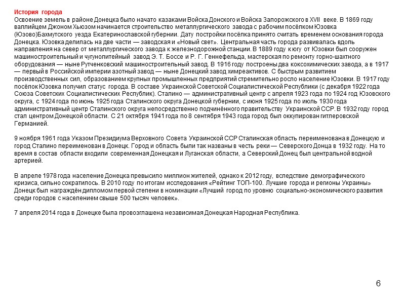 5 Название города С 1869 по 1923 года город носил название Юзовка в честь основателя города — бизнесмена Джона Юза (Хьюза, Hughes). 22 апреля 1924 года решением ВУЦИК городу Юзовка присвоено название Сталино. В конце 1920-х — начале 1930-х годов, без официальных постановлений, город стали именовать Сталино. 9 ноября 1961 года Сталинской области было возвращено её название 1932—1938 годов, данное ей по реке Северский Донец, а её центру г. Сталино было дано название Донецк, несмотря на то, что сам город не находится даже в бассейне реки и что с 1955 уже существовал другой город Донецк, собственно на р. Донец и расположенный в Ростовской области РСФСР. Существует версия, впервые прозвучавшая в романе В. Успенского «Тайный советник вождя», что в 1923 году город несколько месяцев назывался Троцк в честь Л. Д. Троцкого.
