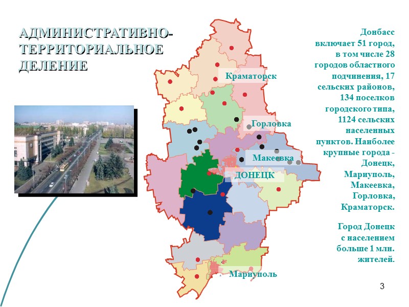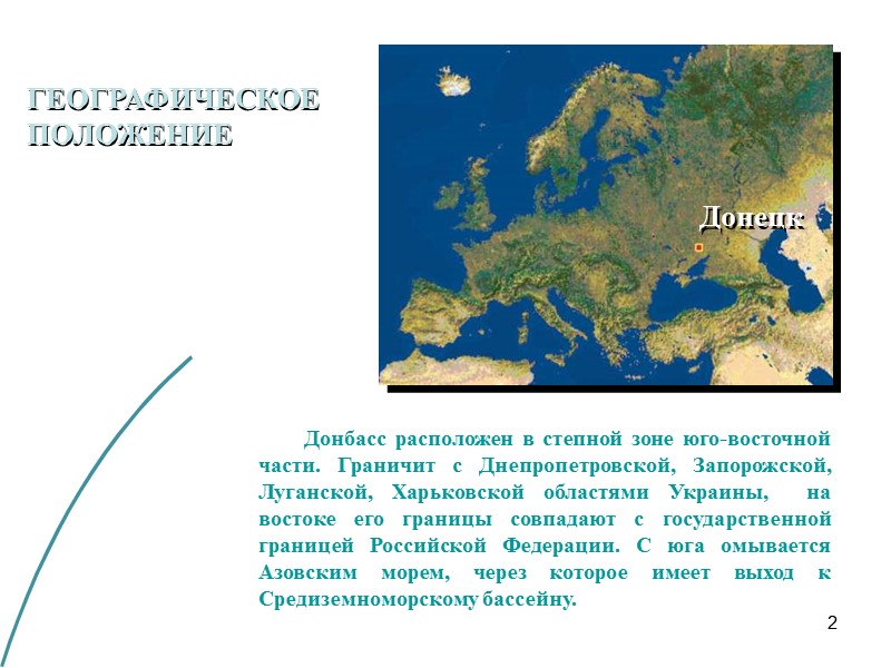 2 ГЕОГРАФИЧЕСКОЕ ПОЛОЖЕНИЕ Донецк Донбасс расположен в степной зоне юго-восточной части. Граничит с Днепропетровской, Запорожской, Луганской, Харьковской областями Украины, на востоке его границы совпадают с государственной границей Российской Федерации. С юга омывается Азовским морем, через которое имеет выход к Средиземноморскому бассейну.