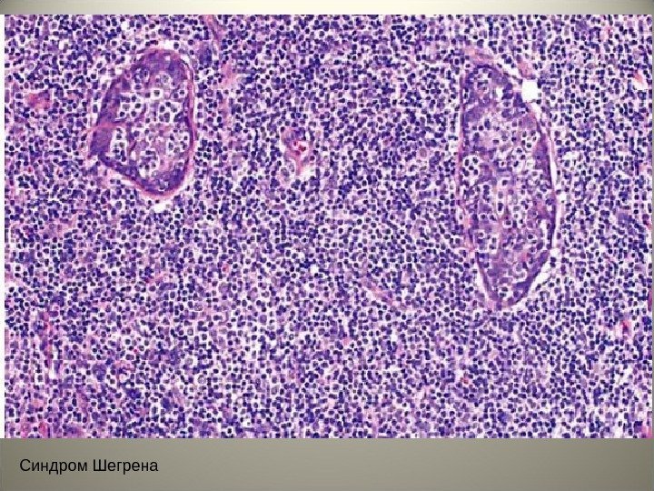 • Патогенез. На современном этапе выделяют два основных механизма. Одним из них являются вирусы с участием протоонкогена c — myc. Характер морфологических изменений в слюнных, слезных железах и суставах идентичен, как предполагают микроскопической картине лимфом. Во втором направлении, -синдром Шегрена, — патология инфекционно-аллергической природы.