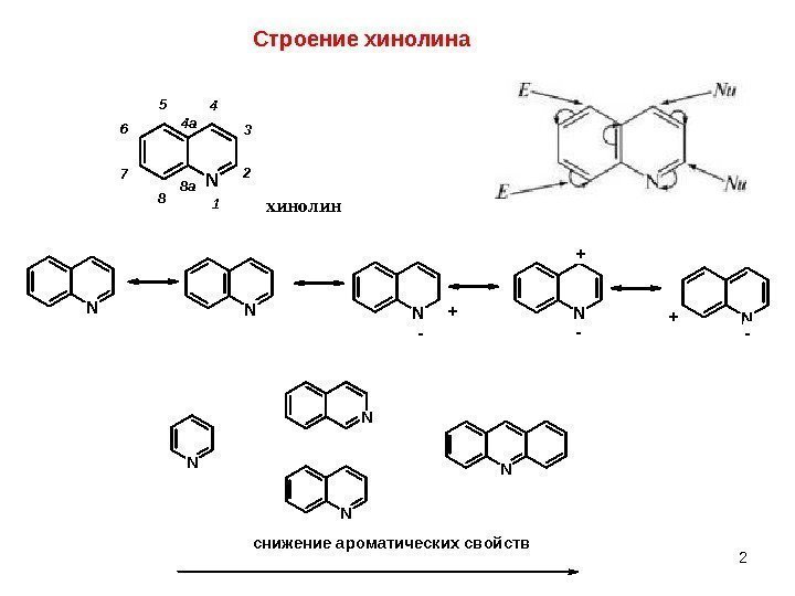 2 Строение хинолина. N 1 2 3 45 6 7 8 4 a 8 a хинолин NNNNN — + — + N N снижение ароматических свойств