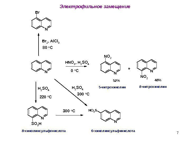 6 Окисление N KMn. O 4 HO — N COOHN COOH CO 2 CH 3 O O OH N O — 2, 3 -пиридиндикарбоновая кислота — пиридин-3 -карбоновая (никотиновая ) кислота 65 C 0 + -N-оксид хинолина