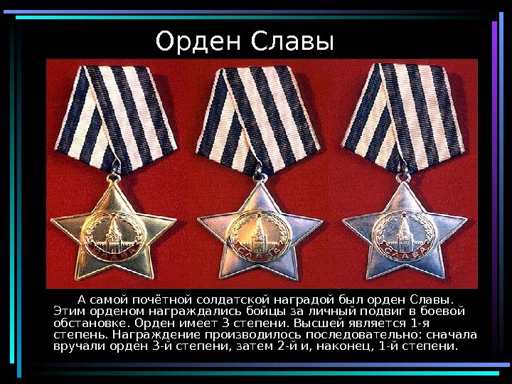 11 Орден Славы А самой почётной солдатской наградой был орден Славы. Этим орденом награждались бойцы за личный подвиг в боевой обстановке. Орден имеет 3 степени. Высшей является 1 -я степень. Награждение производилось последовательно: сначала вручали орден 3 -й степени, затем 2 -й и, наконец, 1 -й степени.