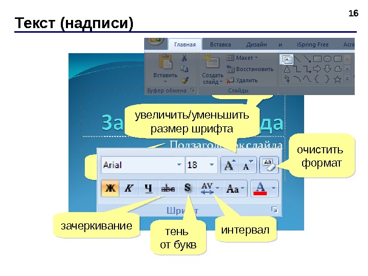 Текст (надписи) 16 ЛКМ зачеркивание тень от букв интервал очистить форматувеличить / уменьшить размер шрифта