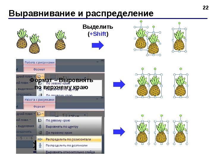 Выравнивание и распределение 22 Формат – Выровнять по верхнему краю Выделить ( +Shift )