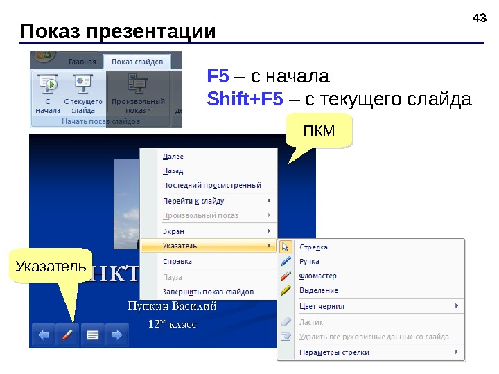 Показ презентации 43 F 5 – с начала Shift+F 5 – с текущего слайда ПКМ Указатель