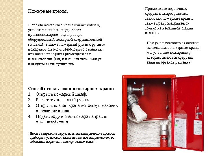 Пожарные краны. В состав пожарного крана входит клапан, установленный на внутреннем противопожарном водопроводе, оборудованный пожарной соединительной головкой, а также пожарный рукав с ручным пожарным стволом. Необходимо отметить, что пожарные краны размещаются в пожарных шкафах, в которых также могут находиться огнетушители. При уже развившемся пожаре использовать пожарные краны могут только пожарные у которых имеются средства защиты органов дыхания. Применение первичных средств пожаротушения, таких как пожарные краны, также предусматривается только на начальной стадии пожара. Способ использования пожарного крана: 1. Открыть пожарный шкаф. 2. Раскатать пожарный рукав. 3. Открыть клапан крана используя маховик на клапане крана. 4. Подать воду в очаг пожара направив пожарный ствол. Нельзя направлять струю воды на электрические провода, приборы и установки, находящиеся под напряжением, во избежание поражения электрическим током.