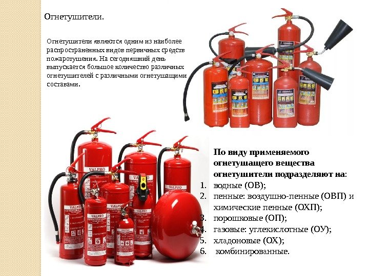 Огнетушители являются одним из наиболее распространенных видов первичных средств пожаротушения. На сегодняшний день выпускается большое количество различных огнетушителей с различными огнетушащими составами. По виду применяемого огнетушащего вещества огнетушители подразделяют на : 1. водные (ОВ); 2. пенные: воздушно-пенные (ОВП) и химические пенные (ОХП); 3. порошковые (ОП); 4. газовые: углекислотные (ОУ); 5. хладоновые (ОХ); 6. комбинированные.