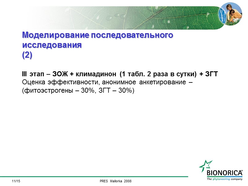 11/15 Моделирование последовательного исследования (2) III этап – ЗОЖ + климадинон (1 табл. 2 раза в сутки) + ЗГТ Оценка эффективности, анонимное анкетирование – (фитоэстрогены – 30%, ЗГТ – 30%)