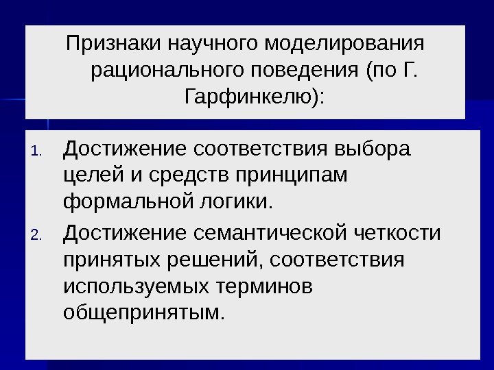 Признаки научного моделирования рационального поведения (по Г. Гарфинкелю): 1. Достижение соответствия выбора целей и средств принципам формальной логики. 2. Достижение семантической четкости принятых решений, соответствия используемых терминов общепринятым.
