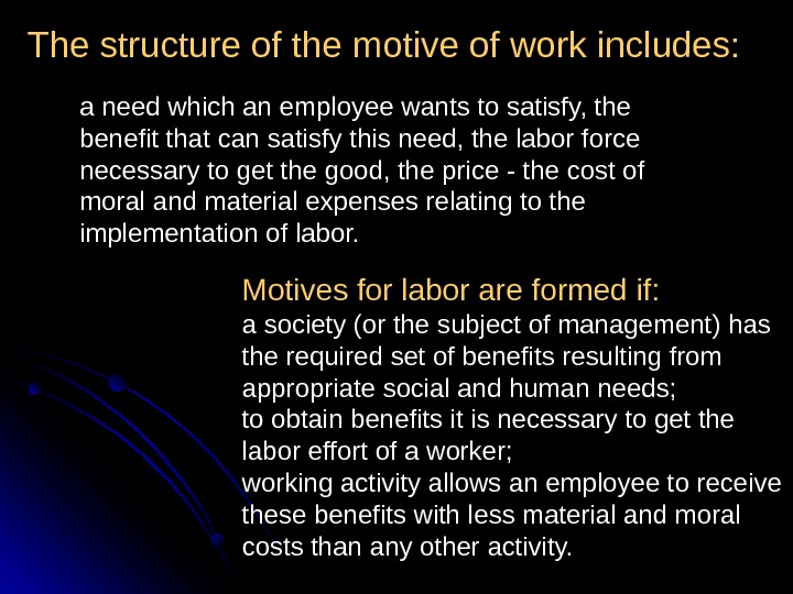 a need which an employee wants to satisfy, the benefit that can satisfy this need, the labor force necessary to get the good, the price — the cost of moral and material expenses relating to the implementation of labor. The structure of the motive of work includes: Motives for labor are formed if: a society (or the subject of management) has the required set of benefits resulting from appropriate social and human needs; to obtain benefits it is necessary to get the labor effort of a worker; working activity allows an employee to receive these benefits with less material and moral costs than any other activity.
