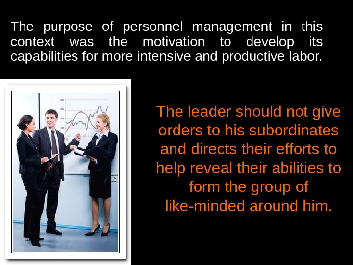 The leader should not give orders to his subordinates and directs their efforts to help reveal their abilities to form the group of like-minded around him. The purpose of personnel management in this context was the motivation to develop its capabilities for more intensive and productive labor.
