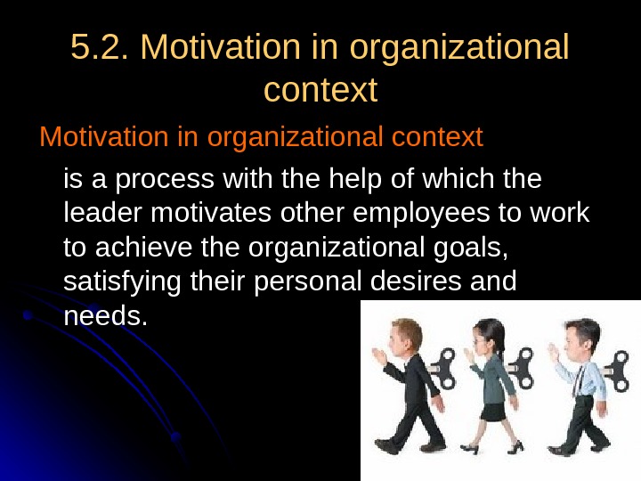5. 2. Motivation in organizational context is a process with the help of which the leader motivates other employees to work to achieve the organizational goals, satisfying their personal desires and needs.