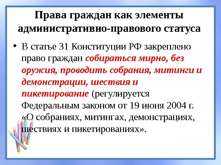 Права граждан как элементы административно-правового статуса • В статье 31 Конституции РФ закреплено право граждан собираться мирно, без оружия, проводить собрания, митинги и демонстрации, шествия и пикетирование (регулируется Федеральным законом от 19 июня 2004 г. «О собраниях, митингах, демонстрациях, шествиях и пикетированиях» .
