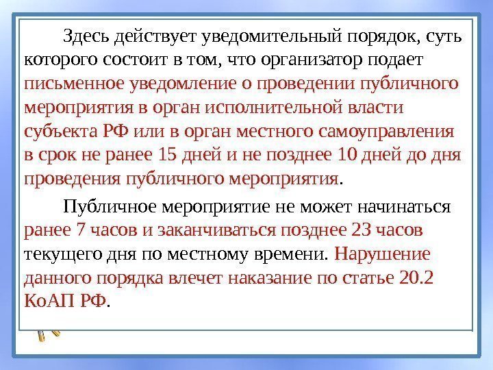 Здесь действует уведомительный порядок, суть которого состоит в том, что организатор подает письменное уведомление о проведении публичного мероприятия в орган исполнительной власти субъекта РФ или в орган местного самоуправления в срок не ранее 15 дней и не позднее 10 дней до дня проведения публичного мероприятия. Публичное мероприятие не может начинаться ранее 7 часов и заканчиваться позднее 23 часов текущего дня по местному времени. Нарушение данного порядка влечет наказание по статье 20. 2 Ко. АП РФ.