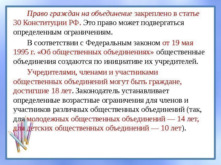 Право граждан на объединение закреплено в статье 30 Конституции РФ. Это право может подвергаться определенным ограничениям. В соответствии с Федеральным законом от 19 мая 1995 г. «Об общественных объединениях» общественные объединения создаются по инициативе их учредителей. Учредителями, членами и участниками общественных объединений могут быть граждане, достигшие 18 лет. Законодатель устанавливает определенные возрастные ограничения для членов и участников различных общественных объединений (так, для молодежных общественных объединений — 14 лет, для детских общественных объединений — 10 лет ).