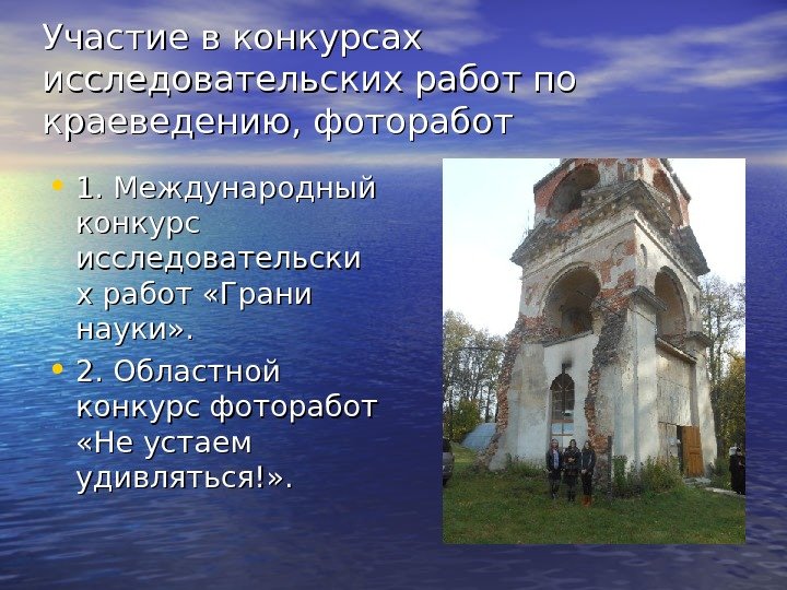 Участие в конкурсах исследовательских работ по краеведению, фоторабот • 1. Международный конкурс исследовательски х работ «Грани науки» . • 2. Областной конкурс фоторабот «Не устаем удивляться!» .