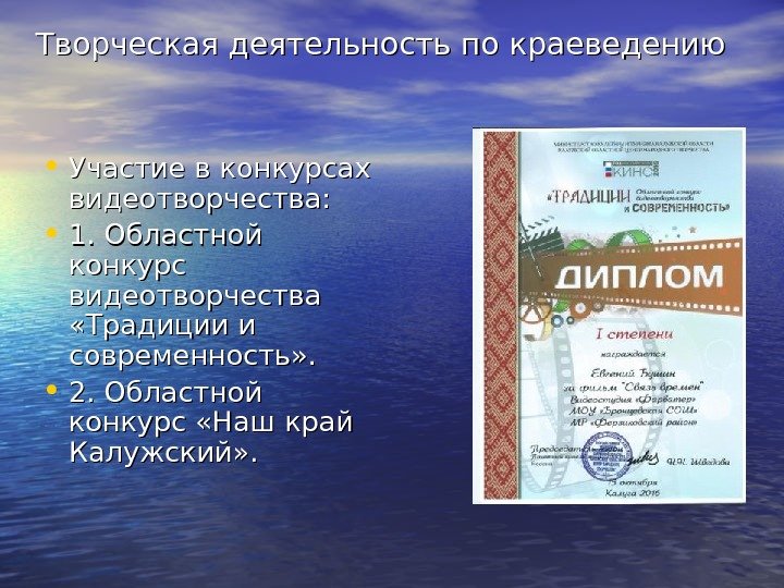 Творческая деятельность по краеведению • Участие в конкурсах видеотворчества: • 1. Областной конкурс видеотворчества «Традиции и современность» . • 2. Областной конкурс «Наш край Калужский» .