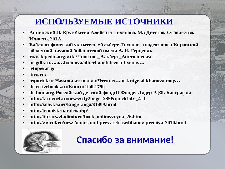 • Аннинский Л. Круг бытия Альберта Лиханова. М. : Детство. Отрочество. Юность, 2012. • Библиогафический указатель «Альберт Лиханов» (подготовлен Кировской областной научной библиотекой имени А. И. Герцена). • ru. wikipedia. org›wiki/Лиханов, _Альберт_Анатольевич • belgdb. ru›…a…lixanova/albert-anatolevich-lixanov… • letopisi. org› • litra. ru› • nsportal. ru›Начальная школа›Чтение›…po-knige-alikhanova-moy… • detectivebooks. ru›Книги› 10491790 • detfond. org›Российский детский фонд›О Фонде› Лидер РДФ› Биография • http: //kirovnet. ru/news/city? page=336&quicktabs_4=1 • http: //znayka. net/knigi/kniga/61409. html • http: //letopisi. ru/index. php/ • http: //library. vladimir. ru/book_online/voyna_26. htm • http: //vrordf. ru/news/anons-and-press-release/lihanov-premiya-2010. html ИСПОЛЬЗУЕМЫЕ ИСТОЧНИКИ Спасибо за внимание!