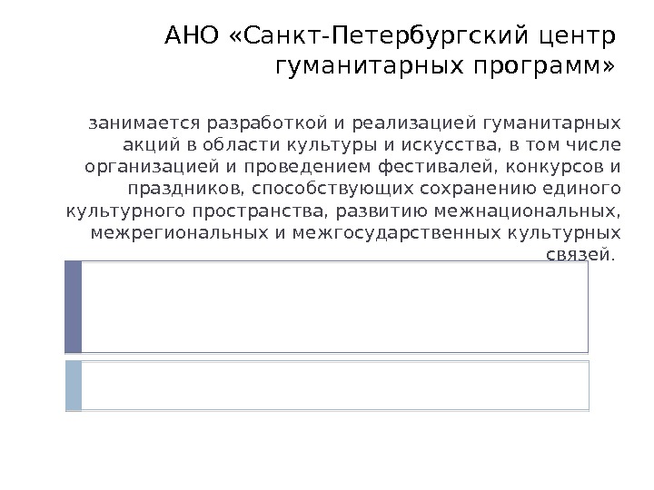 АНО «Санкт-Петербургский центр гуманитарных программ» занимается разработкой и реализацией гуманитарных акций в области культуры и искусства, в том числе организацией и проведением фестивалей, конкурсов и праздников, способствующих сохранению единого культурного пространства, развитию межнациональных, межрегиональных и межгосударственных культурных связей.