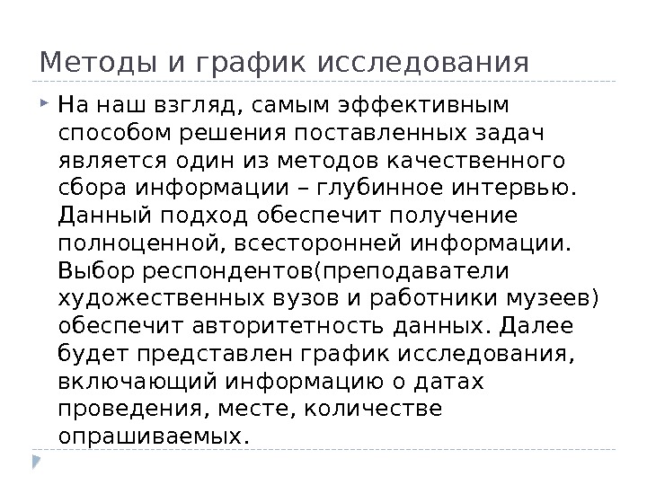 Методы и график исследования На наш взгляд, самым эффективным способом решения поставленных задач является один из методов качественного сбора информации – глубинное интервью. Данный подход обеспечит получение полноценной, всесторонней информации. Выбор респондентов(преподаватели художественных вузов и работники музеев) обеспечит авторитетность данных. Далее будет представлен график исследования, включающий информацию о датах проведения, месте, количестве опрашиваемых.