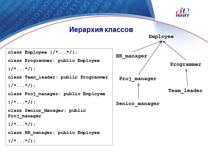 Nortel Networks Confidential Иерархия классов class Employee {/*...*/}; class Programmer: public Employee {/*...*/}; class Team_leader: public Programmer {/*...*/}; class Proj_manager: public Employee {/*...*/}; class Senior_Manager: public Proj_manager {/*...*/}; class HR_manager: public Employee {/*...*/}; Programmer Employee Team_leader Proj_manager Senior_manager HR_manager