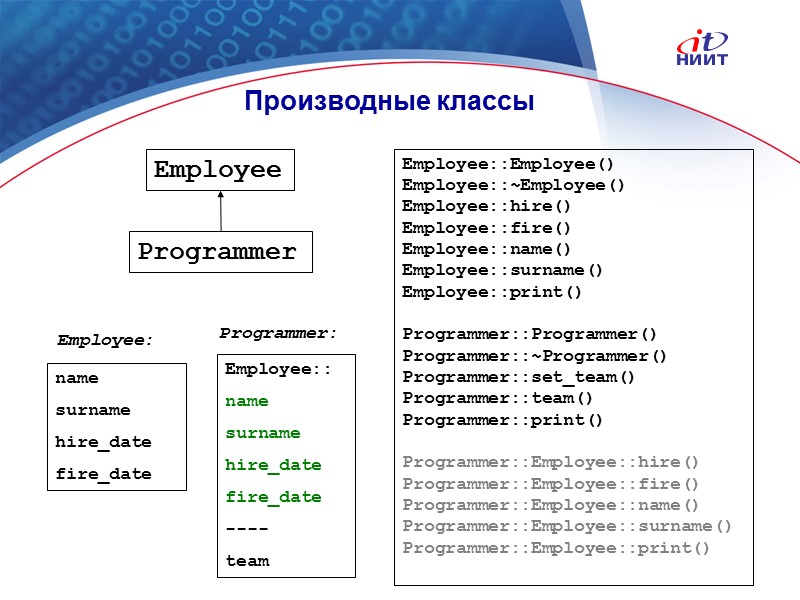 Nortel Networks Confidential Производные классы name surname hire_date fire_date Employee:: name surname hire_date fire_date ---- team Programmer: Employee: Programmer Employee Employee::Employee() Employee::~Employee() Employee::hire() Employee::fire() Employee::name() Employee::surname() Employee::print() Programmer::Programmer() Programmer::~Programmer() Programmer::set_team() Programmer::team() Programmer::print() Programmer::Employee::hire() Programmer::Employee::fire() Programmer::Employee::name() Programmer::Employee::surname() Programmer::Employee::print()