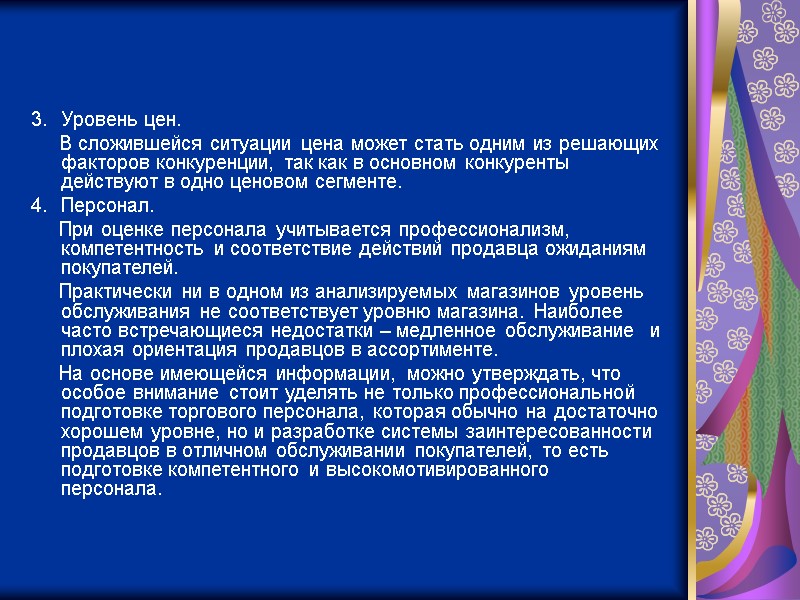 3. Уровень цен. В сложившейся ситуации цена может стать одним из решающих факторов конкуренции, так как в основном конкуренты действуют в одно ценовом сегменте. 4. Персонал. При оценке персонала учитывается профессионализм, компетентность и соответствие действий продавца ожиданиям покупателей. Практически ни в одном из анализируемых магазинов уровень обслуживания не соответствует уровню магазина. Наиболее часто встречающиеся недостатки – медленное обслуживание и плохая ориентация продавцов в ассортименте. На основе имеющейся информации, можно утверждать, что особое внимание стоит уделять не только профессиональной подготовке торгового персонала, которая обычно на достаточно хорошем уровне, но и разработке системы заинтересованности продавцов в отличном обслуживании покупателей, то есть подготовке компетентного и высокомотивированного персонала.
