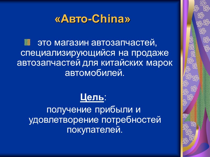 «Авто-China» это магазин автозапчастей, специализирующийся на продаже автозапчастей для китайских марок автомобилей. Цель: получение прибыли и удовлетворение потребностей покупателей.