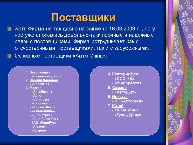 Поставщики Хотя Фирма не так давно на рынке (с 16.03.2009 г.), но у нее уже сложились довольно-таки прочные и надежные связи с поставщиками. Фирма сотрудничает как с отечественными поставщиками, так и с зарубежными. Основные поставщики «Авто-China»: 1. Новосибирск - «Пекинский джип» 2. Нижний Новгород - «Проект ZX» 3. Москва - «АвтоПекин» - «AD-K» - «Centricar» - «Ниолан» - «Альянс-Авто» - «Азиамобиль» - «Диаматрис» - «Chin-China-Car» - ЗАО «ЧериРус» - «Агатол» - «Цитрон» 4. Екатеринбург - «ООО-KS» - «ИнфорАвто» 5. Самара - «Автощит» 6. Иркутск - ИП «Ахтореев» 7. Китай - «Шень-Янь» - «Гуанд-Джоу»