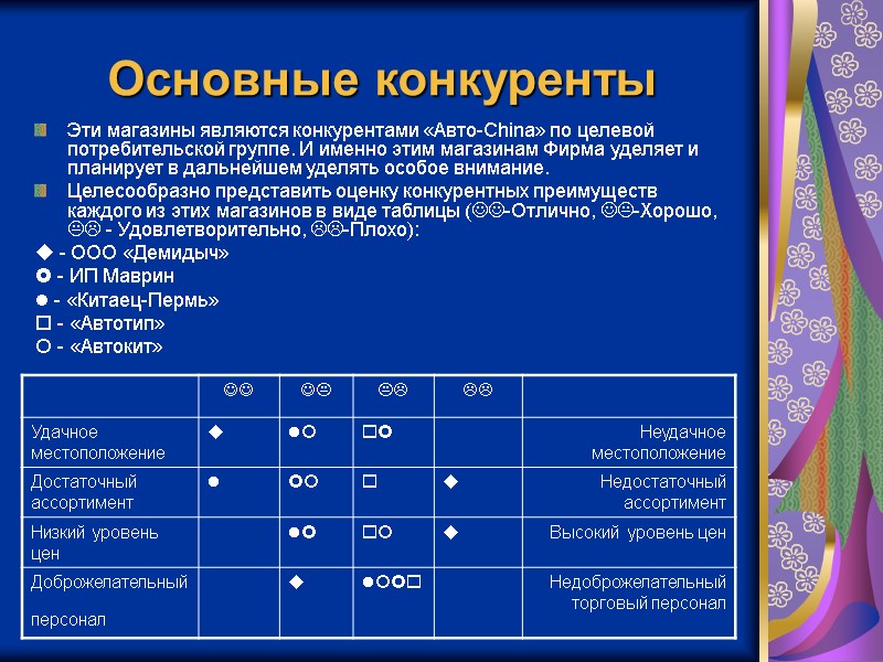 Основные конкуренты Эти магазины являются конкурентами «Авто-China» по целевой потребительской группе. И именно этим магазинам Фирма уделяет и планирует в дальнейшем уделять особое внимание. Целесообразно представить оценку конкурентных преимуществ каждого из этих магазинов в виде таблицы (-Отлично, -Хорошо, - Удовлетворительно, -Плохо): - ООО «Демидыч» - ИП Маврин - «Китаец-Пермь» - «Автотип» - «Автокит»