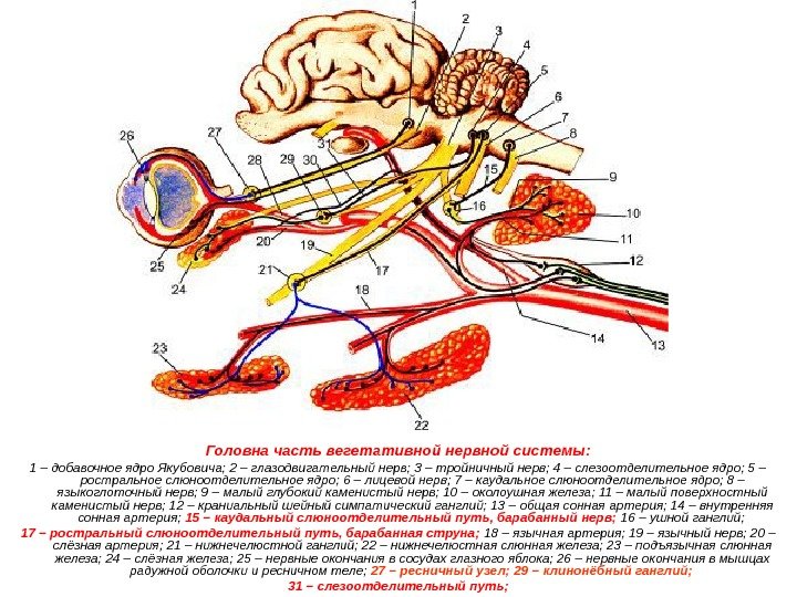 Головна часть вегетативной нервной системы: 1 – добавочное ядро Якубовича; 2 – глазодвигательный нерв; 3 – тройничный нерв; 4 – слезоотделительное ядро; 5 – ростральное слюноотделительное ядро; 6 – лицевой нерв; 7 – каудальное слюноотделительное ядро; 8 – языкоглоточный нерв; 9 – малый глубокий каменистый нерв; 10 – околоушная железа; 11 – малый поверхностный каменистый нерв; 12 – краниальный шейный симпатический ганглий; 13 – общая сонная артерия; 14 – внутренняя сонная артерия; 15 – каудальный слюноотделительный путь, барабанный нерв; 16 – ушной ганглий; 17 – ростральный слюноотделительный путь, барабанная струна; 18 – язычная артерия; 19 – язычный нерв; 20 – слёзная артерия; 21 – нижнечелюстной ганглий; 22 – нижнечелюстная слюнная железа; 23 – подъязычная слюнная железа; 24 – слёзная железа; 25 – нервные окончания в сосудах глазного яблока; 26 – нервные окончания в мышцах радужной оболочки и ресничном теле; 27 – ресничный узел; 29 – клинонебный ганглий; 31 – слезоотделительный путь;