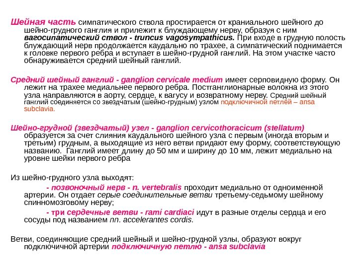 Шейная часть симпатического ствола простирается от краниального шейного до шейно-грудного ганглия и прилежит к блуждающему нерву, образуя с ним вагосипатический ствол — truncus vagos y mpathicus. При входе в грудную полость блуждающий нерв продолжается каудально по трахее, а симпатический поднимается к головке первого ребра и вступает в шейно-грудной ганглий. На этом участке часто обнаруживается средний шейный ганглий. Средний шейный ганглий — ganglion cervicale medium имеет серповидную форму. Он лежит на трахее медиальнее первого ребра. Постганглионарные волокна из этого узла направляются в аорту, сердце, к вагусу и возвратному нерву. Средний шейный ганглий соединяется со звездчатым (шейно-грудным) узлом подключичной петлёй – ansa subclavia. Шейно-грудной (звездчатый) узел — ganglion cervicothoracicum (stellatum) образуется за счет слияния каудального шейного узла с первым (иногда вторым и третьим) грудным, а выходящие из него ветви придают ему форму, соответствующую названию. Ганглий имеет длину до 50 мм и ширину до 10 мм, лежит медиально на уровне шейки первого ребра Из шейно-грудного узла выходят: — позвоночный нерв — n. vertebralis проходит медиально от одноименной артерии. Он отдает серые соединительные ветви третьему-седьмому шейному спинномозговому нерву; — три сердечные ветви — rami cardiaci идут в разные отделы сердца и его сосуды под названием nn. accelerantes cordis. Ветви, соединяющие средний шейный и шейно-грудной узлы, образуют вокруг подключичной артерии подключичную петлю — ansa subclavia