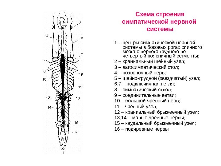 Схема строения симпатической нервной системы 1 – центры симпатической нервной системы в боковых рогах спинного мозга с первого грудного по четвертый поясничный сегменты; 2 – краниальный шейный узел; 3 – вагосимпатический стол; 4 – позвоночный нерв; 5 – шейно-грудной (звездчатый) узел; 6, 7 – подключичная петля; 8 – симпатический ствол; 9 – соединительные ветви; 10 – большой чревный нерв; 11 – чревный узел; 12 – краниальный брыжеечный узел; 13, 14 – малые чревные нервы; 15 – каудальный брыжеечный узел; 16 – подчревные нервы