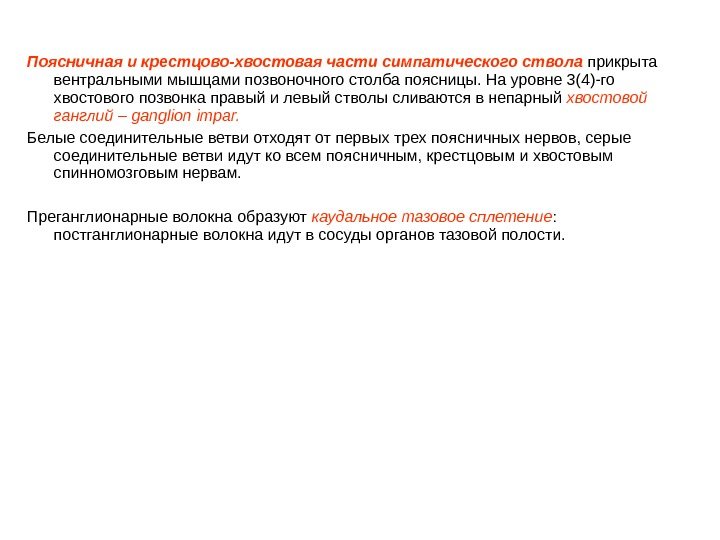 Поясничная и крестцово-хвостовая части симпатического ствола прикрыта вентральными мышцами позвоночного столба поясницы. На уровне 3(4)-го хвостового позвонка правый и левый стволы сливаются в непарный хвостовой ганглий – ganglion impar. Белые соединительные ветви отходят от первых трех поясничных нервов, серые соединительные ветви идут ко всем поясничным, крестцовым и хвостовым спинномозговым нервам. Преганглионарные волокна образуют каудальное тазовое сплетение : постганглионарные волокна идут в сосуды органов тазовой полости.