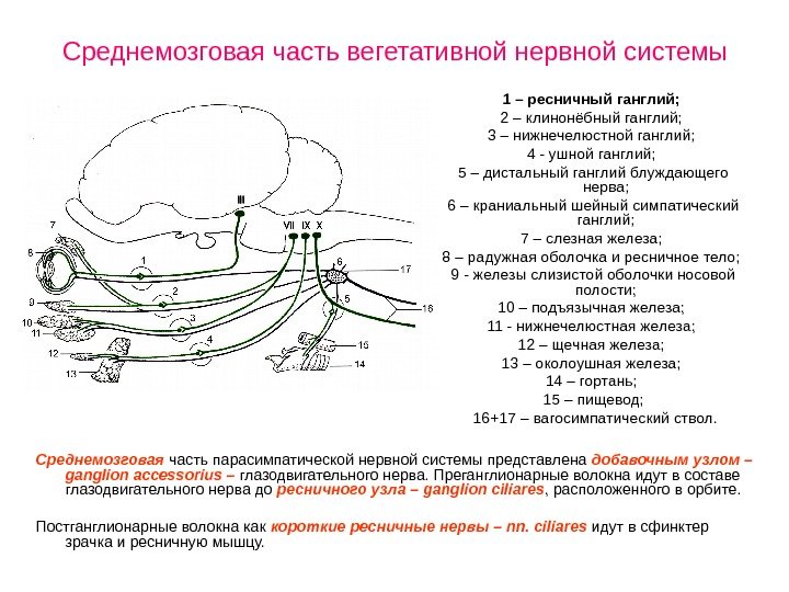 Среднемозговая часть вегетативной нервной системы 1 – ресничный ганглий; 2 – клинонёбный ганглий; 3 – нижнечелюстной ганглий; 4 — ушной ганглий; 5 – дистальный ганглий блуждающего нерва; 6 – краниальный шейный симпатический ганглий; 7 – слезная железа; 8 – радужная оболочка и ресничное тело; 9 — железы слизистой оболочки носовой полости; 10 – подъязычная железа; 11 — нижнечелюстная железа; 12 – щечная железа; 13 – околоушная железа; 14 – гортань; 15 – пищевод; 16+17 – вагосимпатический ствол. Среднемозговая часть парасимпатической нервной системы представлена добавочным узлом – ganglion accessorius – глазодвигательного нерва. Преганглионарные волокна идут в составе глазодвигательного нерва до ресничного узла – ganglion ciliares , расположенного в орбите. Постганглионарные волокна как короткие ресничные нервы – nn. ciliares идут в сфинктер зрачка и ресничную мышцу.