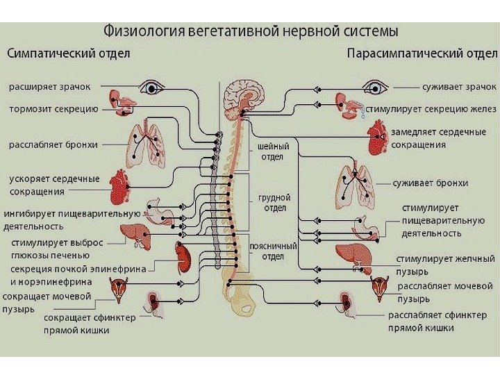 Схема строения парасимпатической нервной системы 1 – среднемозговая часть парасимпатической нервной системы (парасимпатическое ядро глазодвигательного нерва); 2 – среднемозговая часть парасимпатической нервной системы; 3 – дорсальное ядро вагуса; 4 – блуждающий нерв (вагус); 5 – возвратный нерв; 6 – парасимпатические ветви в легкие и сердце; 7 – вентральный ствол вагуса; 8 – дорсальный ствол вагуса; 9, 10 – парасимпатические ветви к органов брюшной полости; 11 — крестцовая часть парасимпатической нервной системы; 12 – тазовые нервы