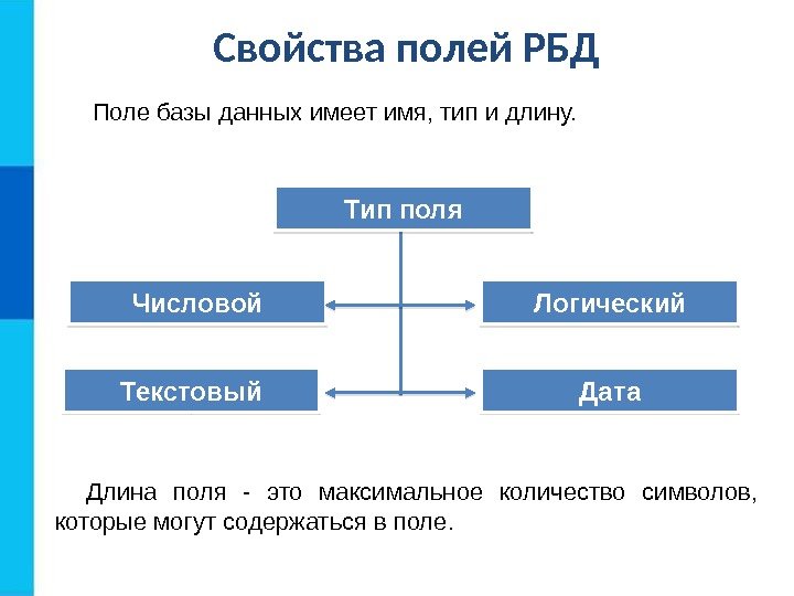 Свойства полей РБД Числовой Текстовый Логический Дата. Тип поля Длина поля — это максимальное количество символов, которые могут содержаться в поле. Поле базы данных имеет имя, тип и длину.