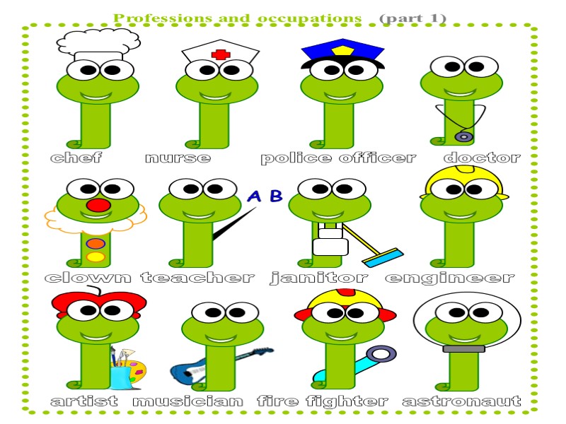 chef nurse police officer doctor clown teacher janitor Скачать презентацию chef nurse police officer doctor clown teacher janitor 40246-family_jobs_1.ppt Количество слайдов: 1 chef nurse police officer doctor clown teacher janitor engineer artist musician fire fighter astronaut