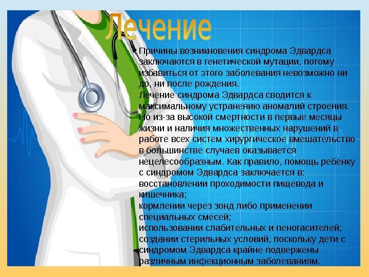 Прогноз для детей с синдромом Эдвардса Учитывая множественные нарушения развития, которые присущи синдрому Эдвардса, прогноз для новорожденных с этим диагнозом почти всегда неблагоприятный. Статистические данные ( из различных независимых исследований ) говорят, что больше половины детей ( 50 – 55% ) не доживают до трехмесячного возраста. Первый день рождения удается отпраздновать меньше чем десяти процентам малышей. Те дети, которые доживают до старшего возраста, имеют серьезнейшие проблемы со здоровьем и нуждаются в постоянном уходе. Для продления жизни нередко необходимы сложные хирургические операции на сердце , почках или других внутренних органах. Исправление врожденных дефектов и постоянный квалифицированный уход, по сути, являются единственным лечением. У детей с классической формой синдрома Эдвардса ( полной трисомией 18 ) шансов на нормальное детство или сколько-нибудь длительную жизнь практически нет. При частичной трисомии или мозаичной форме синдрома прогноз несколько лучше. Средняя продолжительность жизни при этом увеличивается до нескольких лет. Это объясняется тем, то аномалии развития при более легких формах не ведут так быстро к смерти ребенка. П р о г н о з д л я д е т е й с с и н д р о м Э д в а р дс а