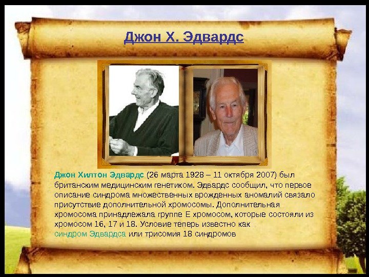 Джон Хилтон Эдвардс (26 марта 1928 – 11 октября 2007) был британским медицинским генетиком. Эдвардс сообщил, что первое описание синдрома множественных врожденных аномалий связало присутствие дополнительной хромосомы. Дополнительная хромосома принадлежала группе E хромосом, которые состояли из хромосом 16, 17 и 18. Условие теперь известно как синдром Эдвардса или трисомия 18 синдромов. Джон Х. Эдвардс