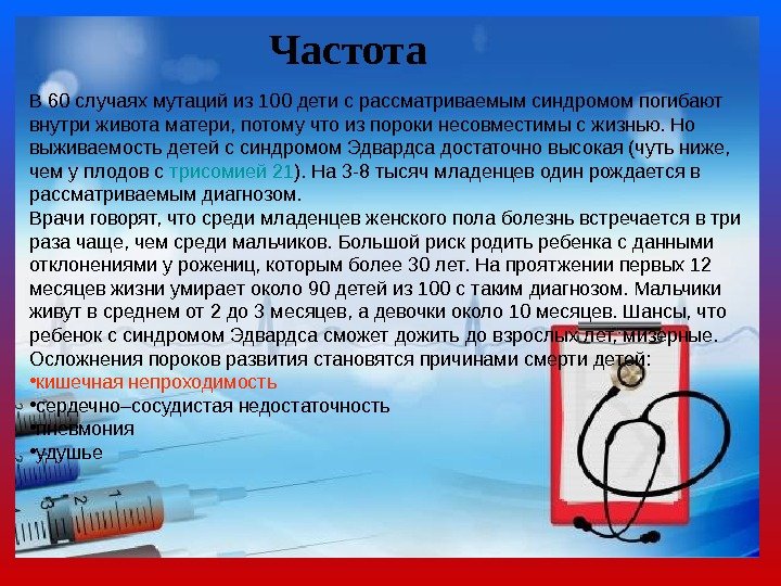 Частота В 60 случаях мутаций из 100 дети с рассматриваемым синдромом погибают внутри живота матери, потому что из пороки несовместимы с жизнью. Но выживаемость детей с синдромом Эдвардса достаточно высокая (чуть ниже, чем у плодов с трисомией 21 ). На 3 -8 тысяч младенцев один рождается в рассматриваемым диагнозом. Врачи говорят, что среди младенцев женского пола болезнь встречается в три раза чаще, чем среди мальчиков. Большой риск родить ребенка с данными отклонениями у рожениц, которым более 30 лет. На проятжении первых 12 месяцев жизни умирает около 90 детей из 100 с таким диагнозом. Мальчики живут в среднем от 2 до 3 месяцев, а девочки около 10 месяцев. Шансы, что ребенок с синдромом Эдвардса сможет дожить до взрослых лет, мизерные. Осложнения пороков развития становятся причинами смерти детей: • кишечная непроходимость • сердечно–сосудистая недостаточность • пневмония • удушье