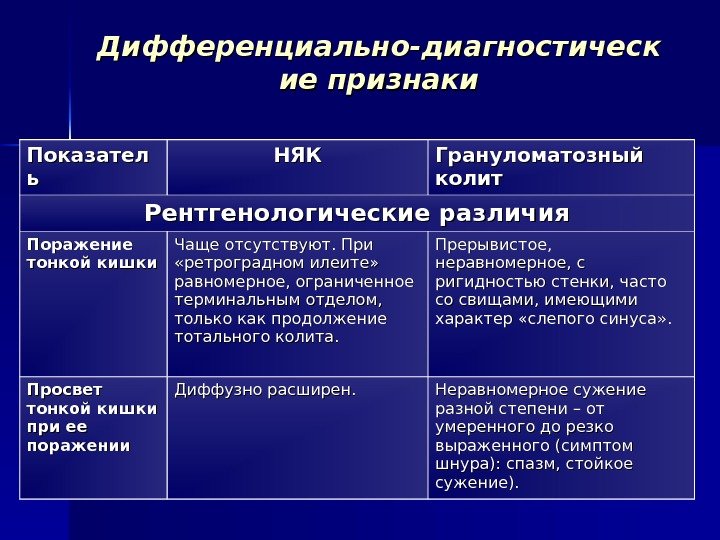 Дифференциально-диагностическ ие признаки Показател ьь НЯКНЯК Грануломатозный колит Рентгенологические различия Поражение тонкой кишки Чаще отсутствуют. При «ретроградном илеите» равномерное, ограниченное терминальным отделом, только как продолжение тотального колита. Прерывистое, неравномерное, с ригидностью стенки, часто со свищами, имеющими характер «слепого синуса» . Просвет тонкой кишки при ее поражении Диффузно расширен. Неравномерное сужение разной степени – от умеренного до резко выраженного (симптом шнура): спазм, стойкое сужение).