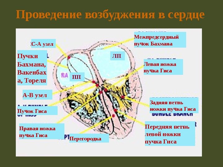 Проведение возбуджения в сердце ЛП ПП Перегородка. А-В узел С-А узел Межпредсердный пучок Бахмана Левая ножка пучка Гиса Правая ножка пучка Гиса Задняя ветвь ножки пучка Гиса Передняя ветвь левой ножки пучка Гиса. Пучки Бахмана, Вакенбах а, Тореля Пучок Гиса