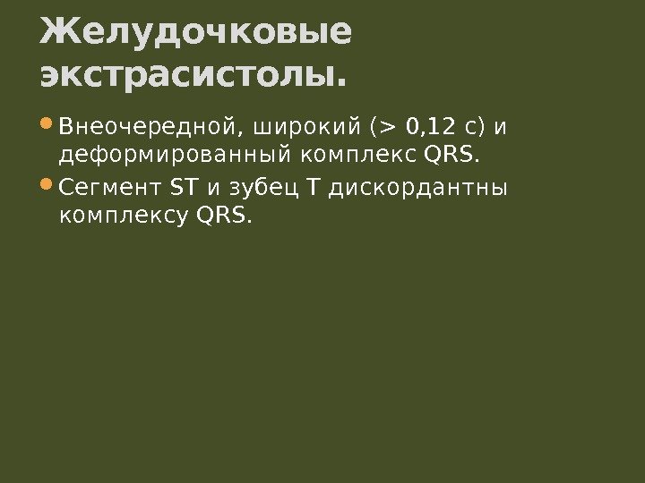 Внеочередной, широкий (>0, 12 с) и деформированный комплекс. QRS. Сегмент. ST и зубец. T дискордантны комплексу. QRS. Желудочковые экстрасистолы.