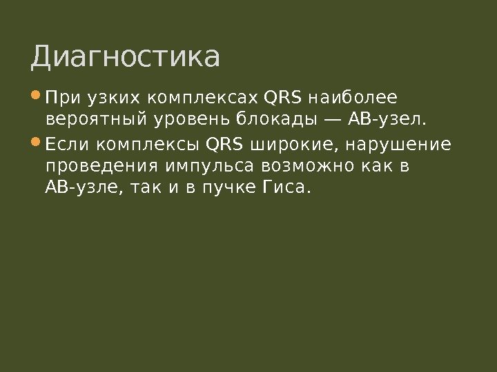При узких комплексах. QRS наиболее вероятный уровень блокады— АВ-узел. Если комплексы. QRS широкие, нарушение проведения возможно как в АВ-узле, так и в пучке Гиса. Диагностика