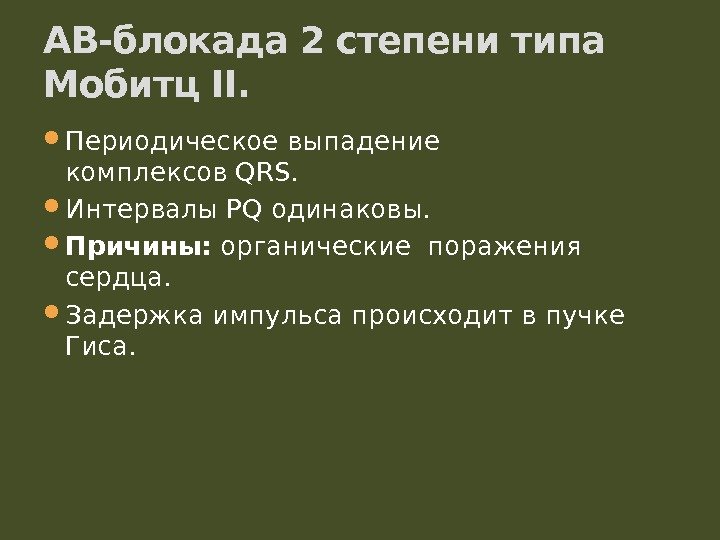 Периодическое выпадение комплексов. QRS. Интервалы. PQ одинаковы. Причины: органические поражения сердца. Задержка импульса происходит в пучке Гиса. АВ-блокада 2 степени типа Мобитц. II.