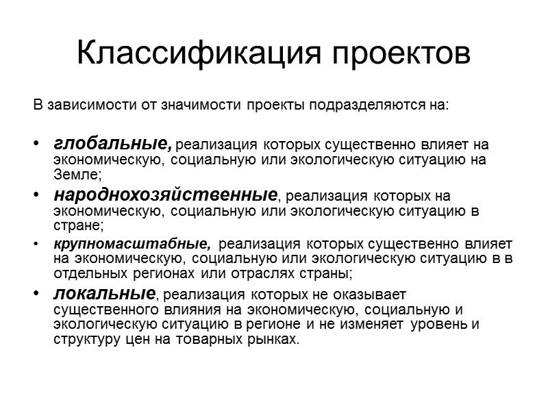 Классификация проектов В зависимости от значимости проекты подразделяются на: глобальные, реализация которых существенно влияет на экономическую, социальную или экологическую ситуацию на Земле; народнохозяйственные, реализация которых на экономическую, социальную или экологическую ситуацию в стране; крупномасштабные, реализация которых существенно влияет на экономическую, социальную или экологическую ситуацию в в отдельных регионах или отраслях страны; локальные, реализация которых не оказывает существенного влияния на экономическую, социальную и экологическую ситуацию в регионе и не изменяет уровень и структуру цен на товарных рынках.