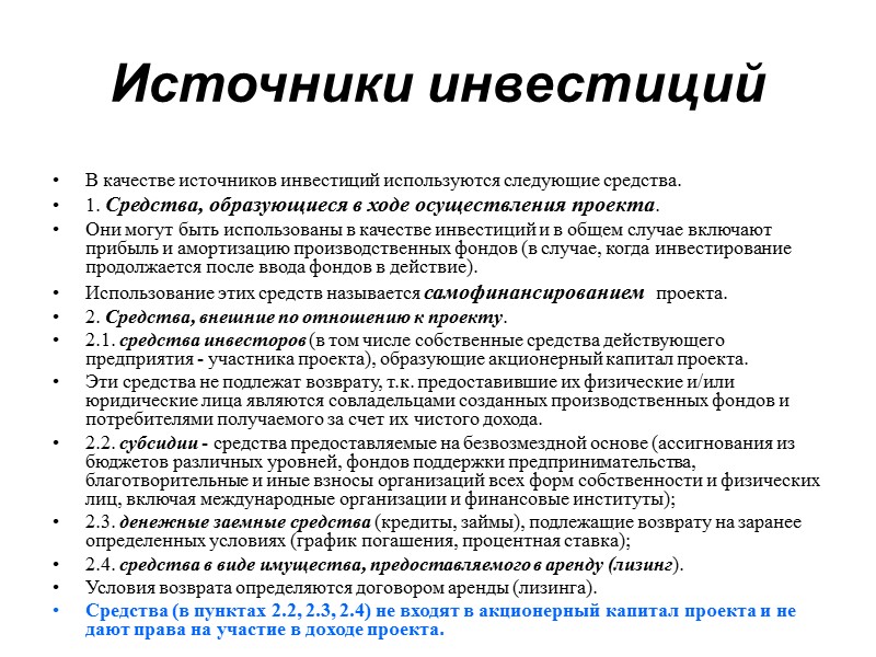 Источники инвестиций В качестве источников инвестиций используются следующие средства. 1. Средства, образующиеся в ходе осуществления проекта. Они могут быть использованы в качестве инвестиций и в общем случае включают прибыль и амортизацию производственных фондов (в случае, когда инвестирование продолжается после ввода фондов в действие). Использование этих средств называется самофинансированием проекта. 2. Средства, внешние по отношению к проекту. 2.1. средства инвесторов (в том числе собственные средства действующего предприятия - участника проекта), образующие акционерный капитал проекта. Эти средства не подлежат возврату, т.к. предоставившие их физические и/или юридические лица являются совладельцами созданных производственных фондов и потребителями получаемого за счет их чистого дохода. 2.2. субсидии - средства предоставляемые на безвозмездной основе (ассигнования из бюджетов различных уровней, фондов поддержки предпринимательства, благотворительные и иные взносы организаций всех форм собственности и физических лиц, включая международные организации и финансовые институты); 2.3. денежные заемные средства (кредиты, займы), подлежащие возврату на заранее определенных условиях (график погашения, процентная ставка); 2.4. средства в виде имущества, предоставляемого в аренду (лизинг). Условия возврата определяются договором аренды (лизинга). Средства (в пунктах 2.2, 2.3, 2.4) не входят в акционерный капитал проекта и не дают права на участие в доходе проекта.