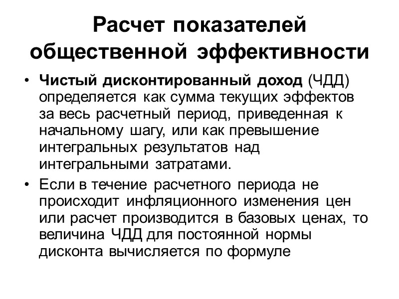 Расчет показателей общественной эффективности Чистый дисконтированный доход (ЧДД) определяется как сумма текущих эффектов за весь расчетный период, приведенная к начальному шагу, или как превышение интегральных результатов над интегральными затратами. Если в течение расчетного периода не происходит инфляционного изменения цен или расчет производится в базовых ценах, то величина ЧДД для постоянной нормы дисконта вычисляется по формуле