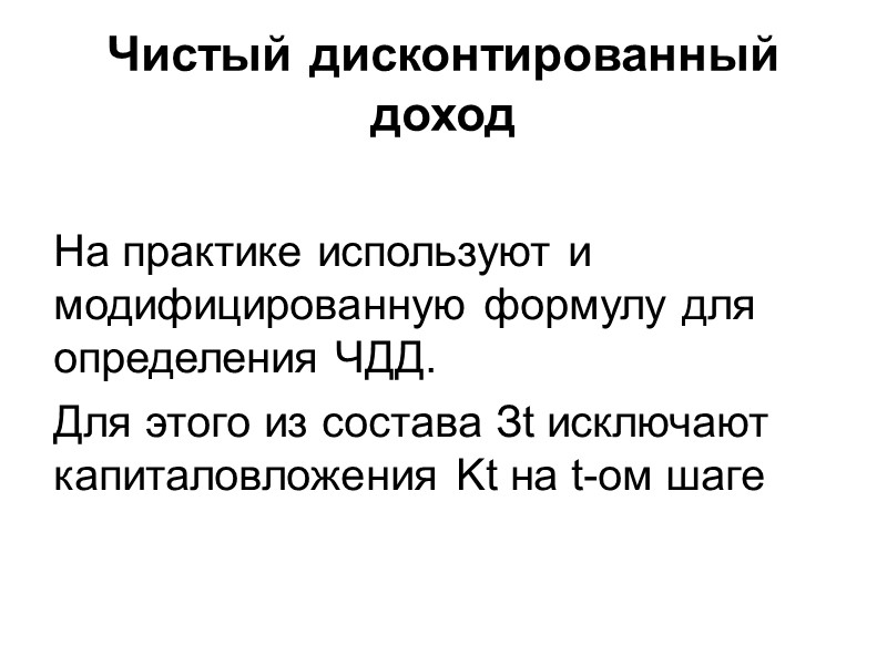 Чистый дисконтированный доход На практике используют и модифицированную формулу для определения ЧДД. Для этого из состава Зt исключают капиталовложения Kt на t-ом шаге
